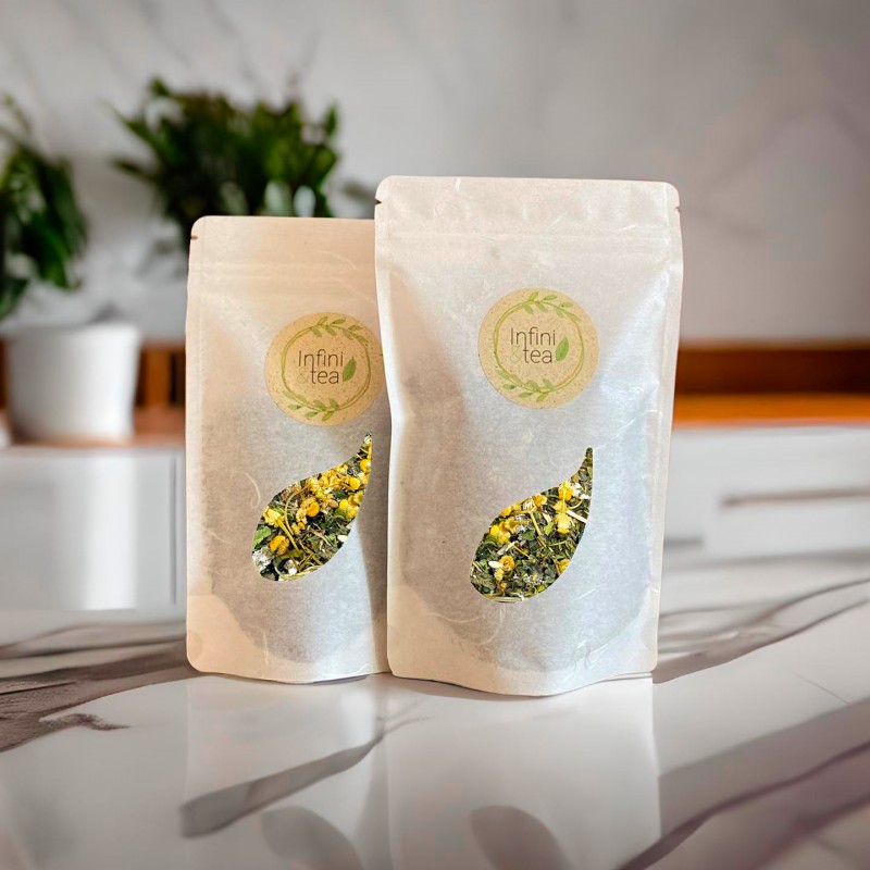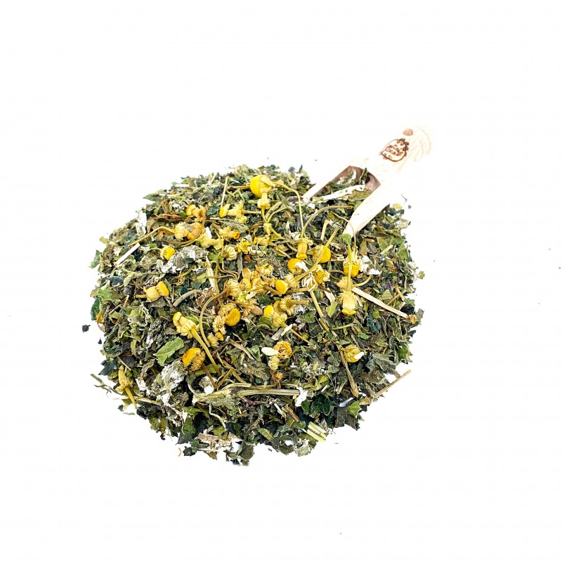 Ortie, mélisse, prêle des champs, alchémille, feuilles de framboisier, millepertuis, achillée, camomille romaine, menthe poivrée.