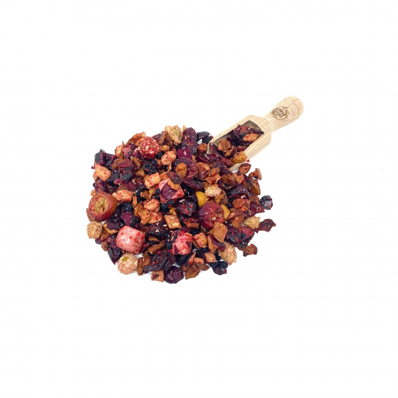 Airelles, morceaux de pomme, baies de sureau, écorce de cynorhodon, betterave rouge, pommes en cube, arôme, marshmallow, poivre rose, camomille romaine (2%), tranches de cranberry.