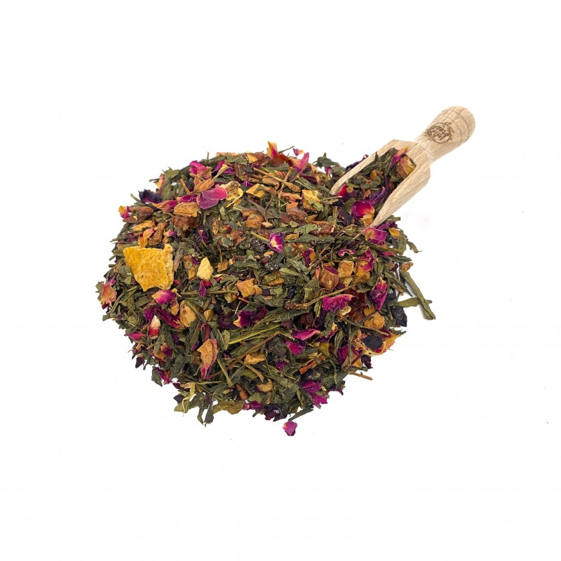 Thé vert, pomme cube, hibiscus, pétales de rose, cynnorhodon, canneberge, queue de cerise, écorce de citron, cerise morello, arômes, tranche de pomme, pétales de souci.