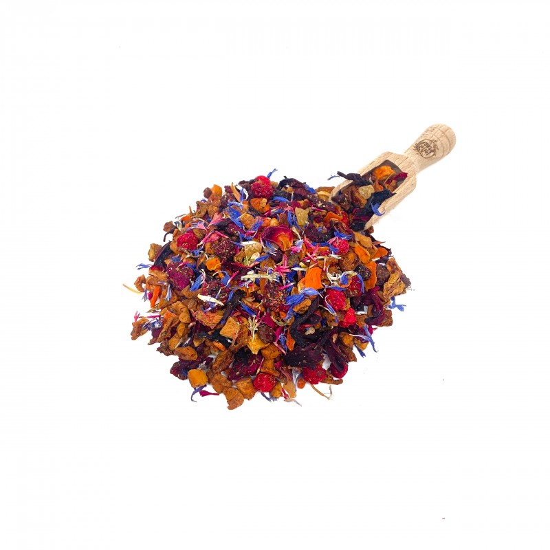 Morceaux de pomme, fleurs d’hibiscus, flocons de carotte, cubes de fruit du dragon violet, dés de gingembre arôme, Cubes d'açaï (3%), feuilles de mûre douce, fleurs de bleuet, myrtille, groseilles, pétales de rose, fleurs de carthame, verveine citronnée.