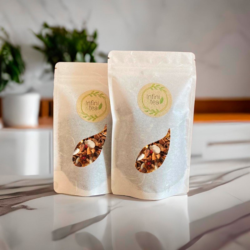 Morceaux de pomme, amandes effilées, tranches d'orange, brisure de cacao, bâton de cannelle, arôme, poivre rose, carthame.