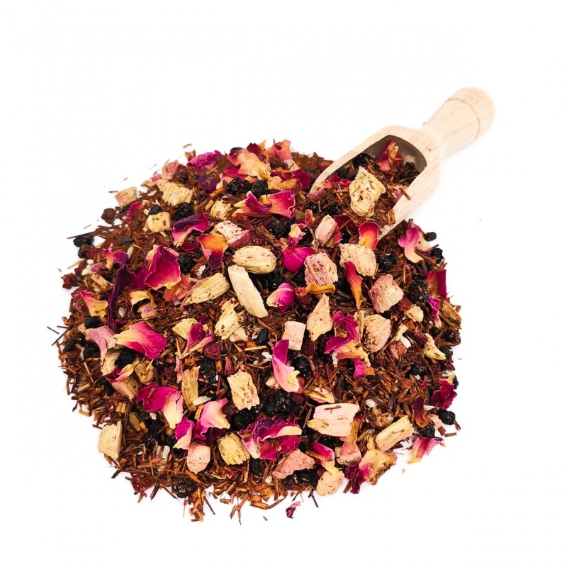 Grande amatrice de Rhubarbe, on la retrouve ici associée à des fruits rouges, le sureau et la noix de coco, un régal qui m'a réconciliée avec le rooibos!