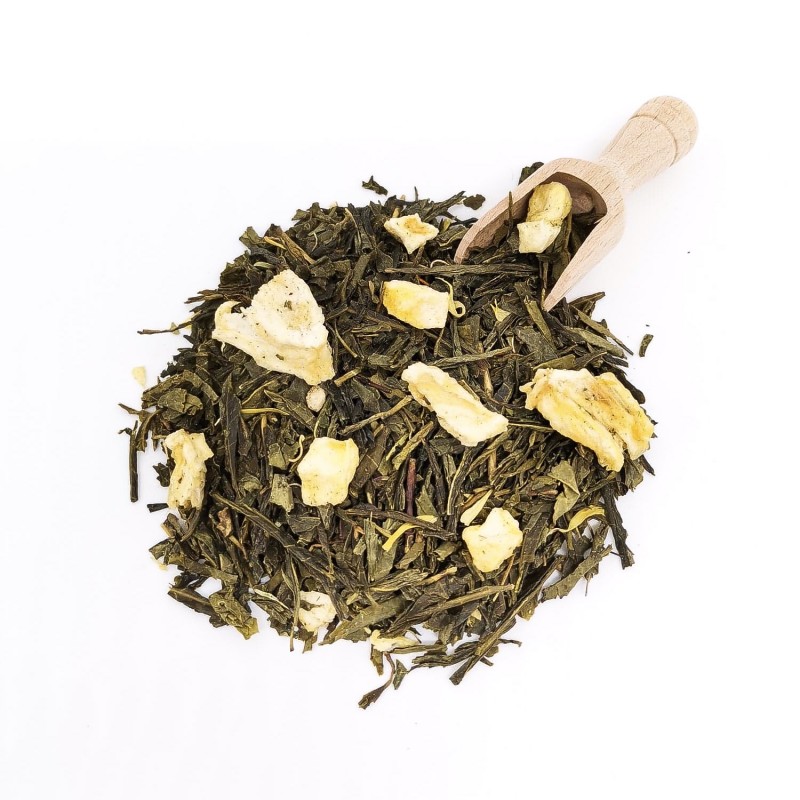 Thé vert Sencha, morceaux d'ananas, cubes de mangue, fleurs de souci, arôme naturel.